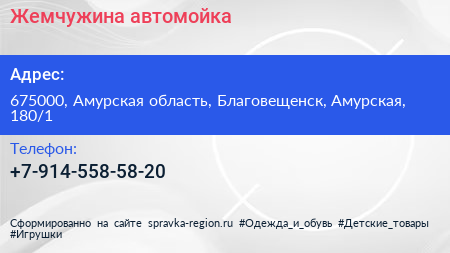 Жемчужина, автомойка по адресу 675000, Амурская область, Благовещенск, Амурская, 180/1 в дальнейшем Организация, размещена в следующих категориях: