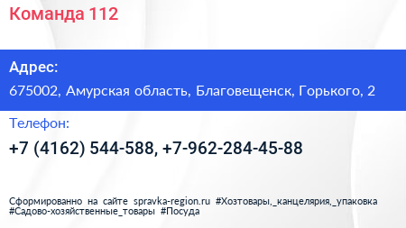 Команда 112 по адресу 675002, Амурская область, Благовещенск, Горького, 2 в дальнейшем Организация, размещена в следующих категориях: