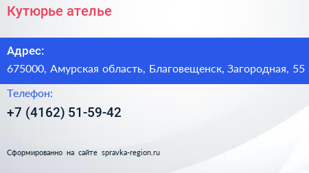 Кутюрье, ателье по адресу 675000, Амурская область, Благовещенск, Загородная, 55 в дальнейшем Организация, размещена в следующих категориях: