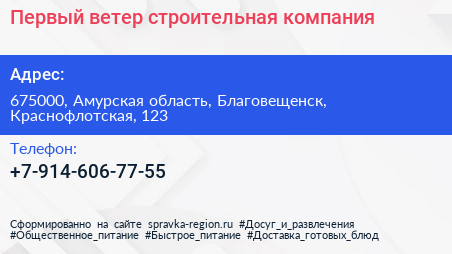Первый ветер, строительная компания по адресу 675000, Амурская область, Благовещенск, Краснофлотская, 123 в дальнейшем Организация, размещена в следующих категориях: