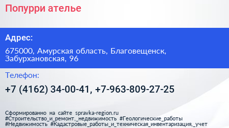 Попурри, ателье по адресу 675000, Амурская область, Благовещенск, Забурхановская, 96 в дальнейшем Организация, размещена в следующих категориях: