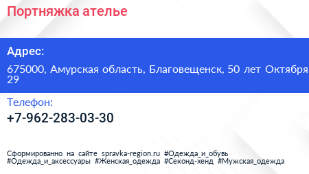 Портняжка, ателье по адресу 675000, Амурская область, Благовещенск, 50 лет Октября, 29 в дальнейшем Организация, размещена в следующих категориях: