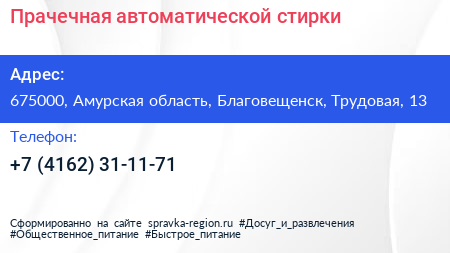 Прачечная автоматической стирки по адресу 675000, Амурская область, Благовещенск, Трудовая, 13 в дальнейшем Организация, размещена в следующих категориях: