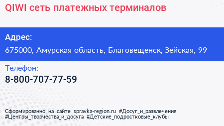 QIWI, сеть платежных терминалов по адресу 675000, Амурская область, Благовещенск, Зейская, 99 в дальнейшем Организация, размещена в следующих категориях: