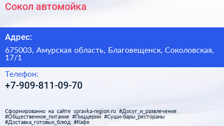 Сокол, автомойка по адресу 675003, Амурская область, Благовещенск, Соколовская, 17/1 в дальнейшем Организация, размещена в следующих категориях: