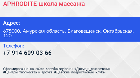 APHRODITE, школа массажа по адресу 675000, Амурская область, Благовещенск, Октябрьская, 120 в дальнейшем Организация, размещена в следующих категориях: