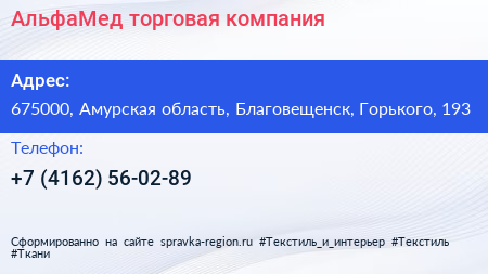 АльфаМед, торговая компания по адресу 675000, Амурская область, Благовещенск, Горького, 193 в дальнейшем Организация, размещена в следующих категориях: