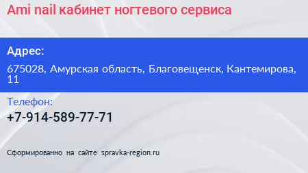 Ami.nail, кабинет ногтевого сервиса по адресу 675028, Амурская область, Благовещенск, Кантемирова, 11 в дальнейшем Организация, размещена в следующих категориях: