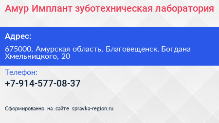 Амур-Имплант, зуботехническая лаборатория по адресу 675000, Амурская область, Благовещенск, Богдана Хмельницкого, 20 в дальнейшем Организация, размещена в следующих категориях: