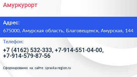 Амуркурорт по адресу 675000, Амурская область, Благовещенск, Амурская, 144 в дальнейшем Организация, размещена в следующих категориях: