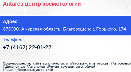 Antares, центр косметологии по адресу 675000, Амурская область, Благовещенск, Горького, 174 в дальнейшем Организация, размещена в следующих категориях: