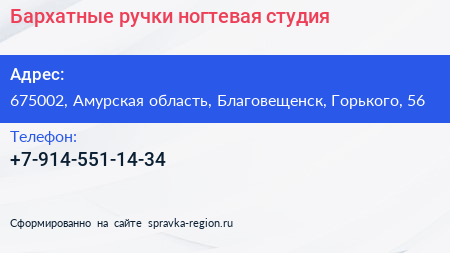 Бархатные ручки, ногтевая студия по адресу 675002, Амурская область, Благовещенск, Горького, 56 в дальнейшем Организация, размещена в следующих категориях: