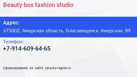 Beauty box fashion studio по адресу 675002, Амурская область, Благовещенск, Амурская, 89 в дальнейшем Организация, размещена в следующих категориях: