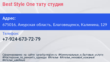 Best.Style.One, тату-студия по адресу 675016, Амурская область, Благовещенск, Калинина, 129 в дальнейшем Организация, размещена в следующих категориях: