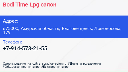 Bodi Time Lpg, салон по адресу 675000, Амурская область, Благовещенск, Ломоносова, 179 в дальнейшем Организация, размещена в следующих категориях: