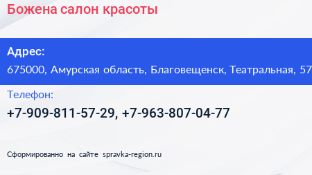 Божена, салон красоты по адресу 675000, Амурская область, Благовещенск, Театральная, 57 в дальнейшем Организация, размещена в следующих категориях: