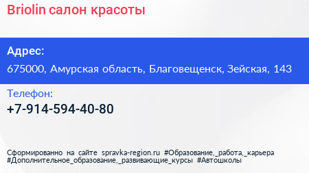 Briolin, салон красоты по адресу 675000, Амурская область, Благовещенск, Зейская, 143 в дальнейшем Организация, размещена в следующих категориях: