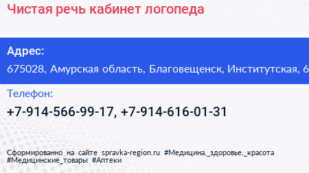 Чистая речь, кабинет логопеда по адресу 675028, Амурская область, Благовещенск, Институтская, 6 в дальнейшем Организация, размещена в следующих категориях: