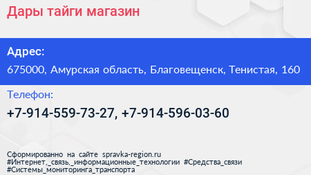 Дары тайги, магазин по адресу 675000, Амурская область, Благовещенск, Тенистая, 160 в дальнейшем Организация, размещена в следующих категориях: