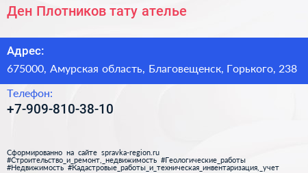 Ден Плотников, тату-ателье по адресу 675000, Амурская область, Благовещенск, Горького, 238 в дальнейшем Организация, размещена в следующих категориях: