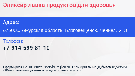 Эликсир, лавка продуктов для здоровья по адресу 675000, Амурская область, Благовещенск, Ленина, 213 в дальнейшем Организация, размещена в следующих категориях: