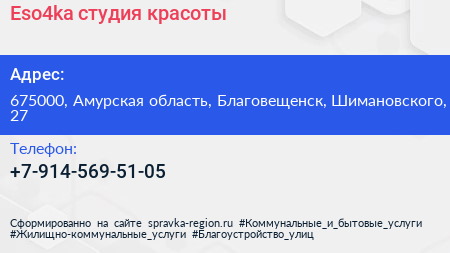 Eso4ka, студия красоты по адресу 675000, Амурская область, Благовещенск, Шимановского, 27 в дальнейшем Организация, размещена в следующих категориях: