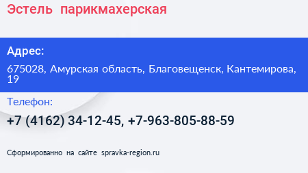Эстель+, парикмахерская по адресу 675028, Амурская область, Благовещенск, Кантемирова, 19 в дальнейшем Организация, размещена в следующих категориях: