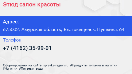 Этюд, салон красоты по адресу 675002, Амурская область, Благовещенск, Пушкина, 64 в дальнейшем Организация, размещена в следующих категориях: