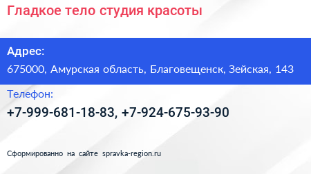 Гладкое тело, студия красоты по адресу 675000, Амурская область, Благовещенск, Зейская, 143 в дальнейшем Организация, размещена в следующих категориях: