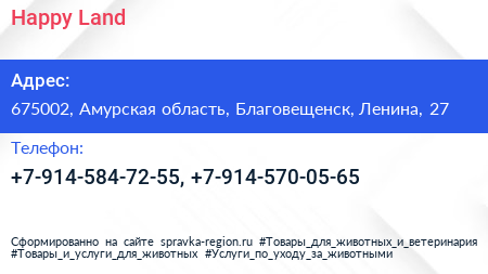 Happy Land по адресу 675002, Амурская область, Благовещенск, Ленина, 27 в дальнейшем Организация, размещена в следующих категориях: