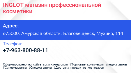INGLOT, магазин профессиональной косметики по адресу 675000, Амурская область, Благовещенск, Мухина, 114 в дальнейшем Организация, размещена в следующих категориях: