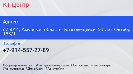 КТ-Центр по адресу 675014, Амурская область, Благовещенск, 50 лет Октября, 195/1 в дальнейшем Организация, размещена в следующих категориях: