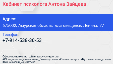 Кабинет психолога Антона Зайцева по адресу 675002, Амурская область, Благовещенск, Ленина, 77 в дальнейшем Организация, размещена в следующих категориях: