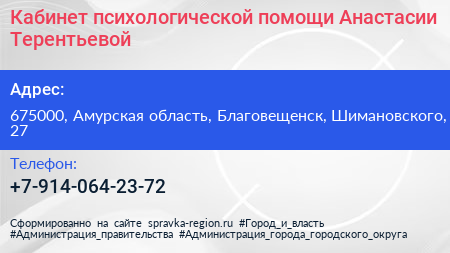 Кабинет психологической помощи Анастасии Терентьевой по адресу 675000, Амурская область, Благовещенск, Шимановского, 27 в дальнейшем Организация, размещена в следующих категориях: