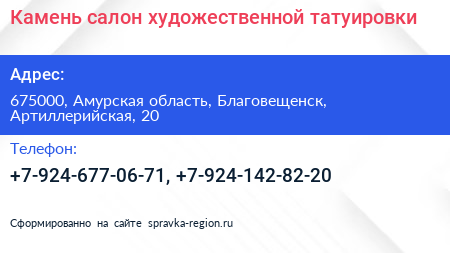 Камень, салон художественной татуировки по адресу 675000, Амурская область, Благовещенск, Артиллерийская, 20 в дальнейшем Организация, размещена в следующих категориях:
