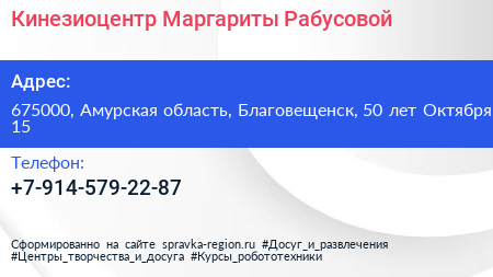 Кинезиоцентр Маргариты Рабусовой по адресу 675000, Амурская область, Благовещенск, 50 лет Октября, 15 в дальнейшем Организация, размещена в следующих категориях: