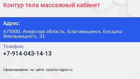 Контур тела, массажный кабинет по адресу 675000, Амурская область, Благовещенск, Богдана Хмельницкого, 31 в дальнейшем Организация, размещена в следующих категориях:
