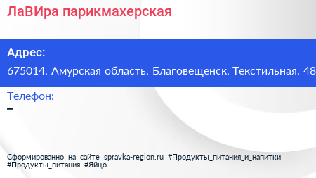 ЛаВИра, парикмахерская по адресу 675014, Амурская область, Благовещенск, Текстильная, 48 в дальнейшем Организация, размещена в следующих категориях: