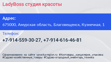 LadyBoss, студия красоты по адресу 675000, Амурская область, Благовещенск, Кузнечная, 1 в дальнейшем Организация, размещена в следующих категориях: