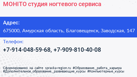 MOHITO, студия ногтевого сервиса по адресу 675000, Амурская область, Благовещенск, Заводская, 147 в дальнейшем Организация, размещена в следующих категориях: