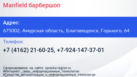 Manfield, барбершоп по адресу 675002, Амурская область, Благовещенск, Горького, 64 в дальнейшем Организация, размещена в следующих категориях: