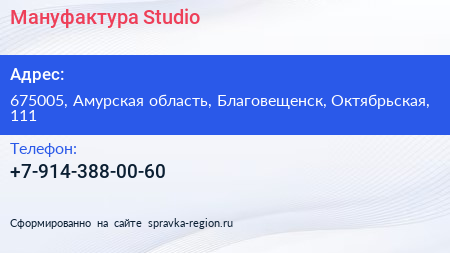 Мануфактура Studio по адресу 675005, Амурская область, Благовещенск, Октябрьская, 111 в дальнейшем Организация, размещена в следующих категориях:
