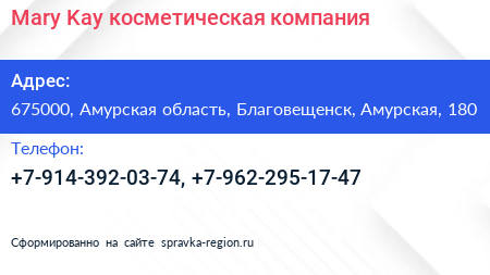 Mary Kay, косметическая компания по адресу 675000, Амурская область, Благовещенск, Амурская, 180 в дальнейшем Организация, размещена в следующих категориях: