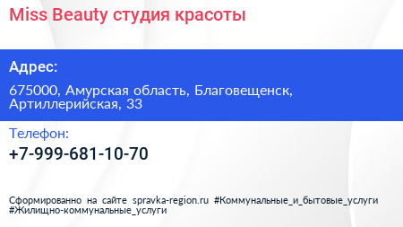Miss Beauty, студия красоты по адресу 675000, Амурская область, Благовещенск, Артиллерийская, 33 в дальнейшем Организация, размещена в следующих категориях: