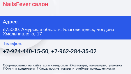 NailsFever, салон по адресу 675000, Амурская область, Благовещенск, Богдана Хмельницкого, 17 в дальнейшем Организация, размещена в следующих категориях: