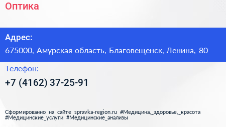 Оптика по адресу 675000, Амурская область, Благовещенск, Ленина, 80 в дальнейшем Организация, размещена в следующих категориях: