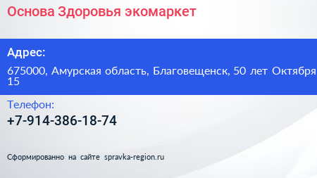 Основа Здоровья, экомаркет по адресу 675000, Амурская область, Благовещенск, 50 лет Октября, 15 в дальнейшем Организация, размещена в следующих категориях: