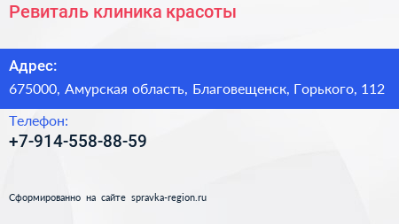 Ревиталь, клиника красоты по адресу 675000, Амурская область, Благовещенск, Горького, 112 в дальнейшем Организация, размещена в следующих категориях: