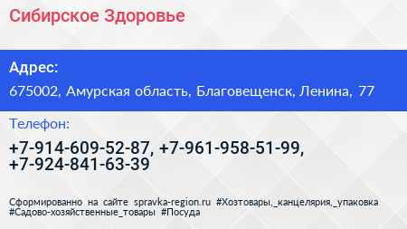 Сибирское Здоровье по адресу 675002, Амурская область, Благовещенск, Ленина, 77 в дальнейшем Организация, размещена в следующих категориях: