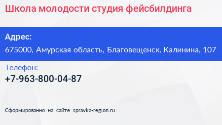 Школа молодости, студия фейсбилдинга по адресу 675000, Амурская область, Благовещенск, Калинина, 107 в дальнейшем Организация, размещена в следующих категориях: